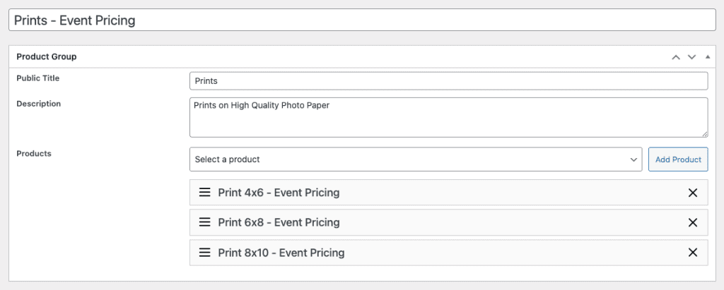 - A group called “Event Prints” might have a selection of prints with different pricing from your regular pricing.