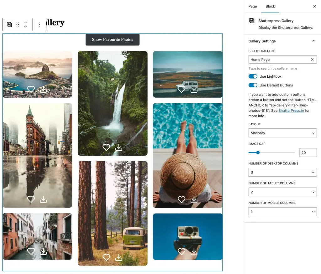 ShutterPress includes a dedicated Gutenberg block that lets you easily insert galleries into any post or page without needing shortcodes.